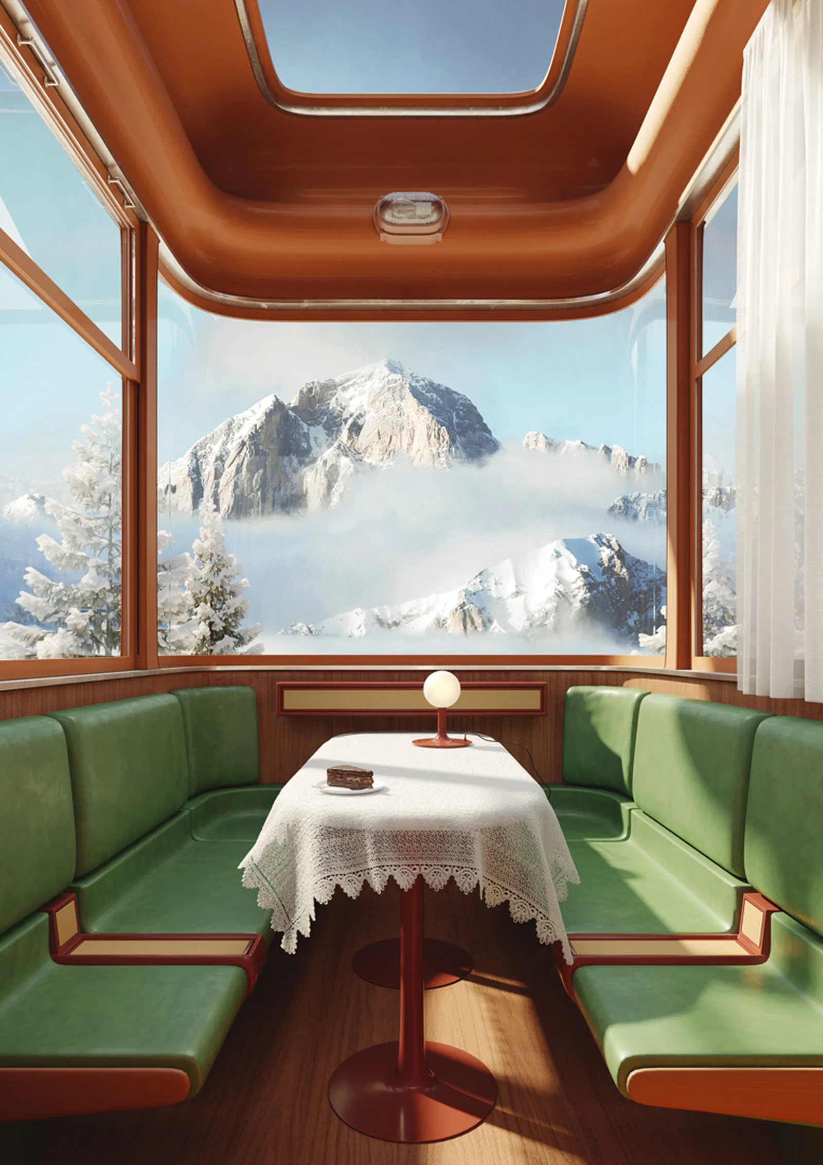 A cable car journeys through a dramatic mountain landscape, rendered with a striking blend of realism and graphic simplification. The piece evokes feelings of travel, isolation, […]